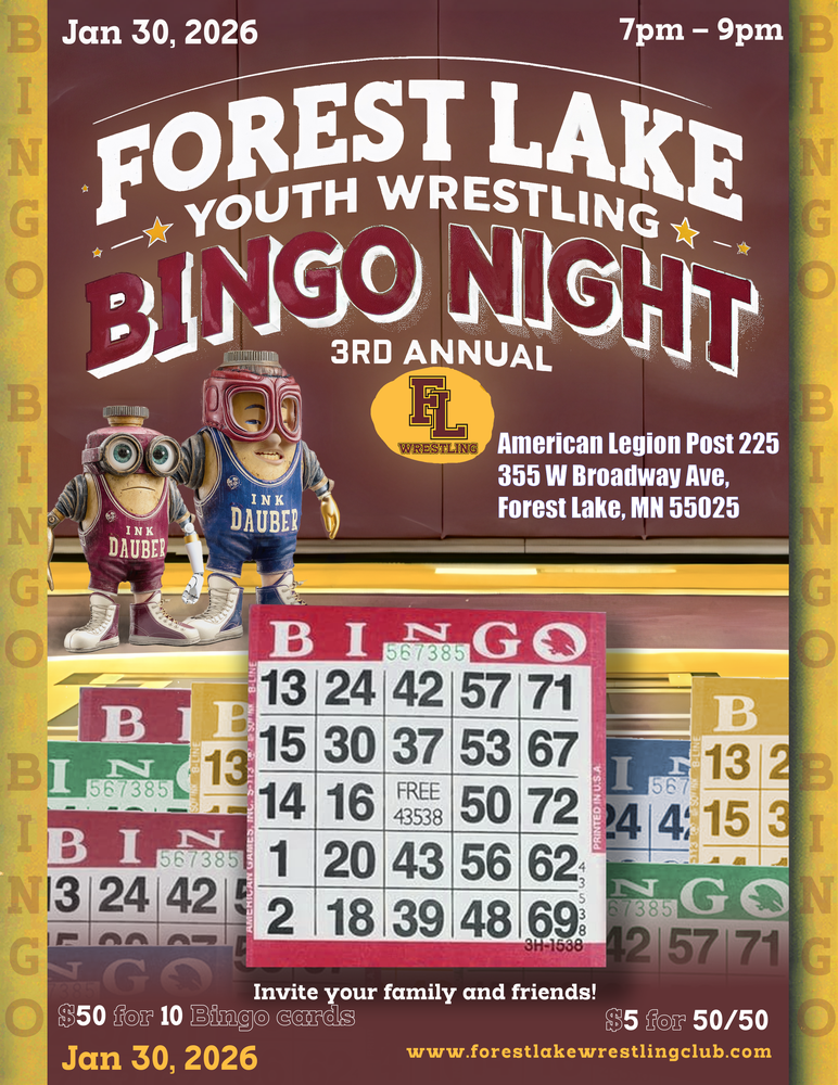 Bingo FundraiserJanuary 30, 2026 at the American Legion Post 225 in Forest Lake! See you there!7pm - 9pm